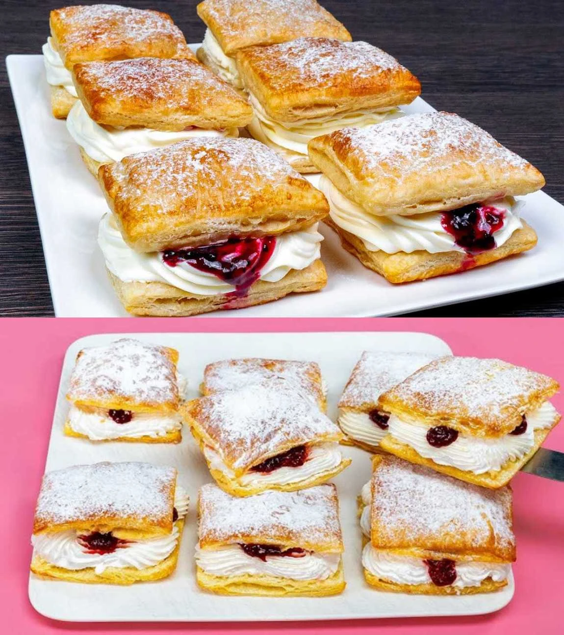 Möchten Sie ein elegantes und erfrischendes Gebäck zubereiten, das wie ein Traum schmeckt? Dieses himmlisch zarte Dessert aus Blätterteig mit feiner Eigelbcreme und Blaubeermarmelade ist genau das Richtige. Die Kombination aus zartem Teig, samtiger Creme und fruchtiger Frische schafft eine Harmonie der Aromen, die jeder Naschkatze gefallen wird.