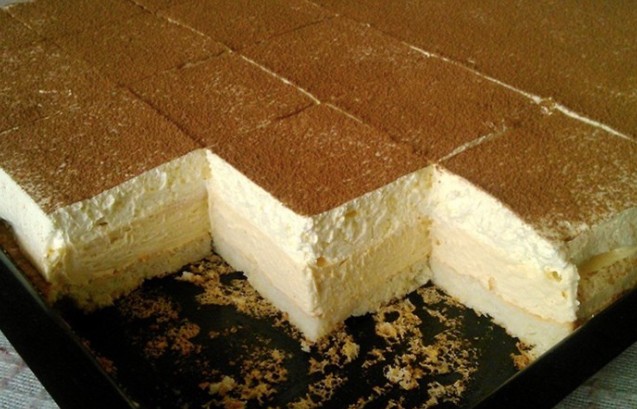 - Zusammenstellung des Eistortes: Verteilen Sie auf dem abgekühlten Teig die vorbereitete Creme und anschließend die selbst geschlagene Sahne. Nach Belieben können Sie den Kuchen mit Kakao bestreuen.