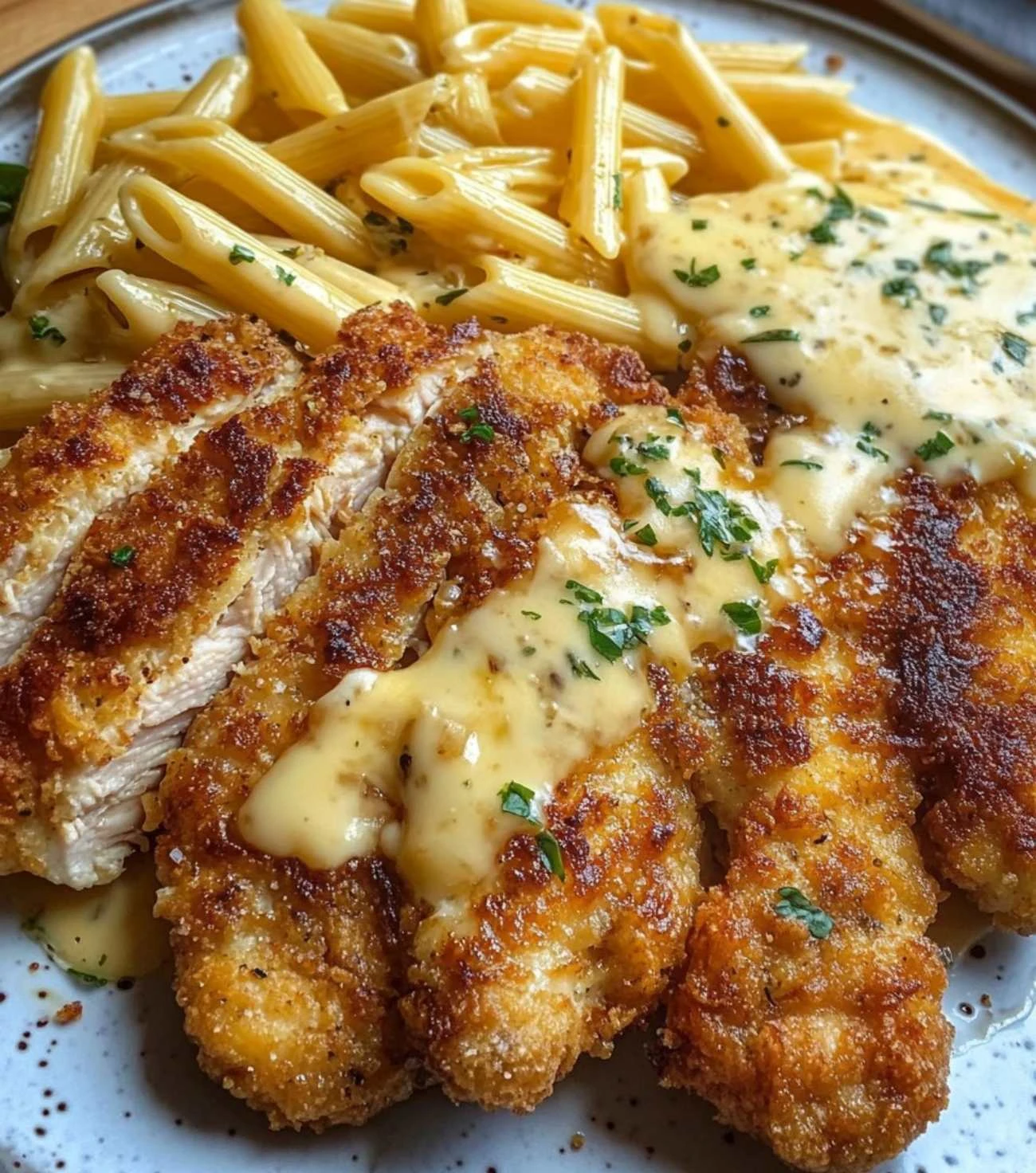 Knusprige Hähnchenschnitzel mit Knoblauch-Käse-Sauce und butterigen Nudeln