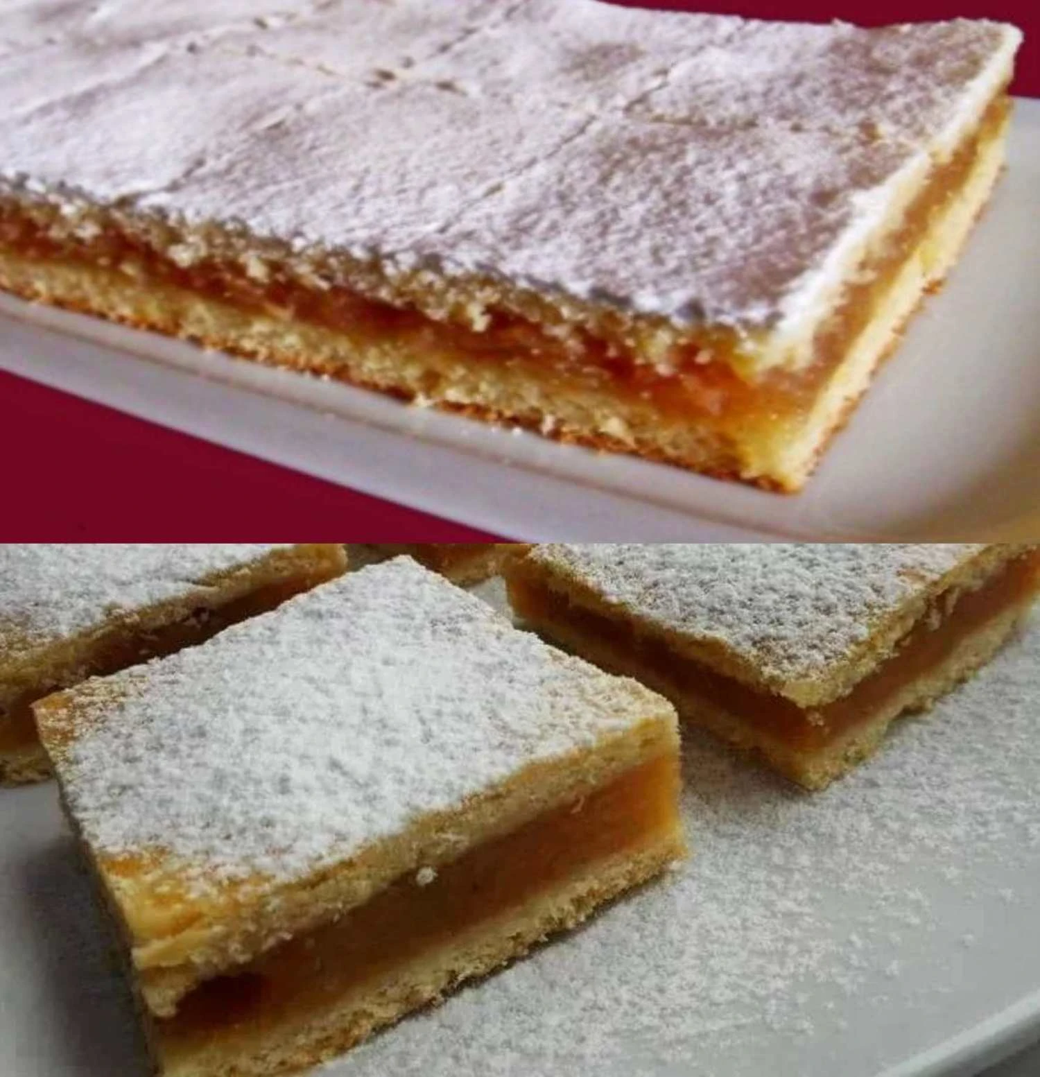 • Fertigstellung Die Oberfläche mit Puderzucker bestäuben. Mindestens 30 Minuten ruhen lassen, damit sich die Schnitten besser schneiden lassen. Mit einem scharfen Messer in ordentliche Portionen schneiden.