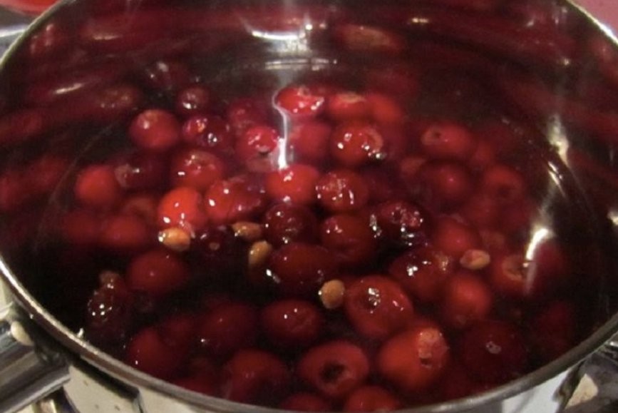 - Geben Sie die Kirschen zusammen mit den Blättern in einen Topf, gießen Sie das Wasser dazu und lassen Sie es bei schwacher Hitze köcheln.