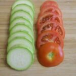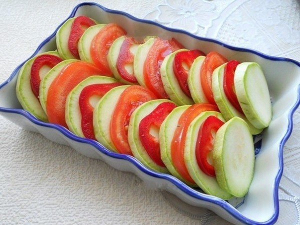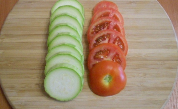 - Gemüse vorbereiten: Zuerst die Zucchini, Tomaten und Paprika waschen. Schneiden Sie das Gemüse in Scheiben wie auf dem Bild oder wie es Ihnen gefällt.