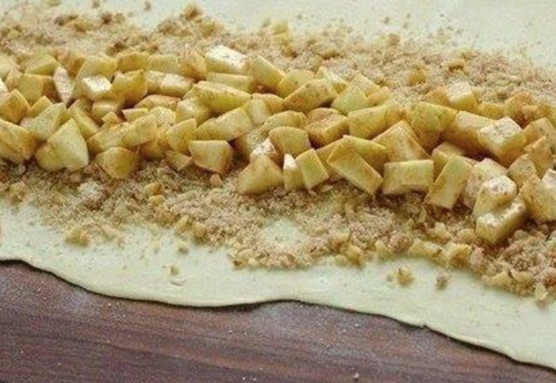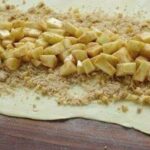 - Einen Blätterteig ausrollen, mit der Nussmischung und dann mit der Apfelmischung bestreuen.