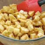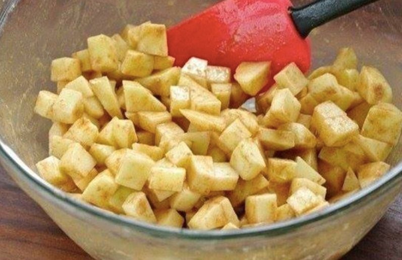 - Dann in eine Schüssel geben und mit Zimt, braunem und weißem Zucker sowie Mehl bestreuen.