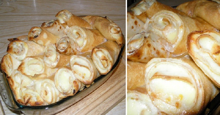 - 5. Backen: Fetten Sie eine tiefe Form mit Butter ein und legen Sie die Pfannkuchen hinein. Bereiten Sie eine Mischung aus 100 ml Milch, einem Eigelb und einem Esslöffel Zucker vor, die Sie über die Pfannkuchen gießen.