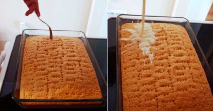 - Durchtränken des Kuchens: Nach dem Backen stechen Sie den Boden mit einer Gabel ein und gießen die vorbereitete Milchmischung nach und nach darüber. Lassen Sie ihn einziehen.