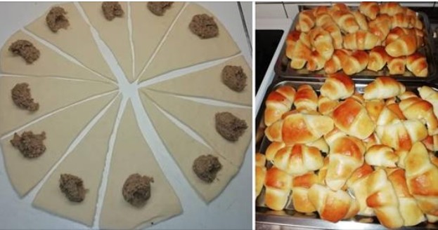 - Formen der Hörnchen: Jeden der Laibe zu einem dünnen Kreis ausrollen und in 12 Dreiecke teilen. Auf den breiteren Teil des Dreiecks einen Teelöffel Füllung geben und zu einem Hörnchen aufrollen.