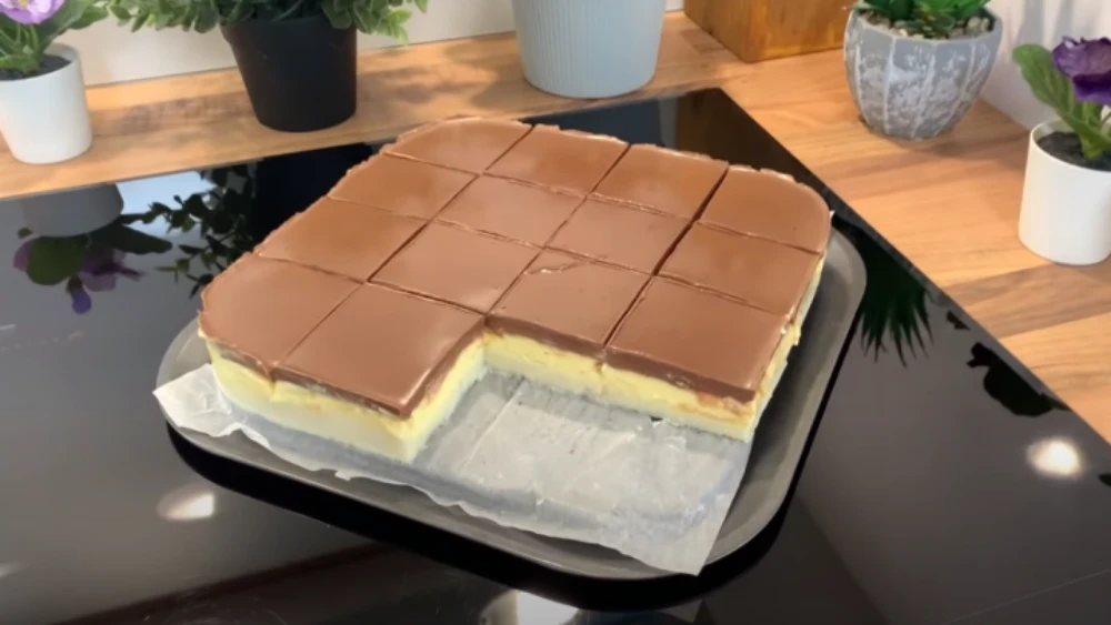 • Schokoladenglasur: Erwärmen Sie in einem Topf die Schlagsahne (250 ml), fügen Sie die zerbrochene Schokolade hinzu und rühren, bis sie vollständig geschmolzen ist. Etwas abkühlen lassen und über die Cremeschicht gießen.