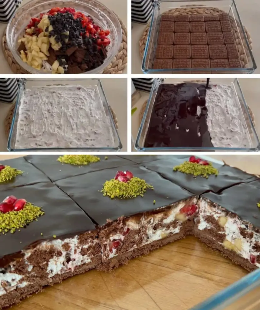 Dieser nicht gebackene Kuchen mit Obst und Schokoladenglasur ist die ideale Wahl, wenn Sie etwas Eindrucksvolles, aber zugleich Einfaches zubereiten möchten. Die Kombination aus frischem Obst, luftiger Creme und Kakaokeksen ergibt ein Dessert, das wunderbar leicht und erfrischend schmeckt. Die Zubereitung gelingt auch völligen Anfängern und am Tisch ist Ihnen der Erfolg garantiert.