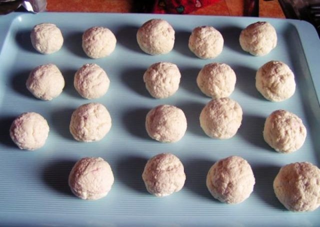 - Teigzubereitung: Geben Sie den Quark in eine Schüssel, fügen Sie grobes Mehl, Grieß, Zucker, Salz und das Ei hinzu. Alles mit den Händen gut vermischen und zu einem glatten Teig verarbeiten. Wenn der Quark von guter Qualität ist, sollte der Teig nicht zu sehr kleben.