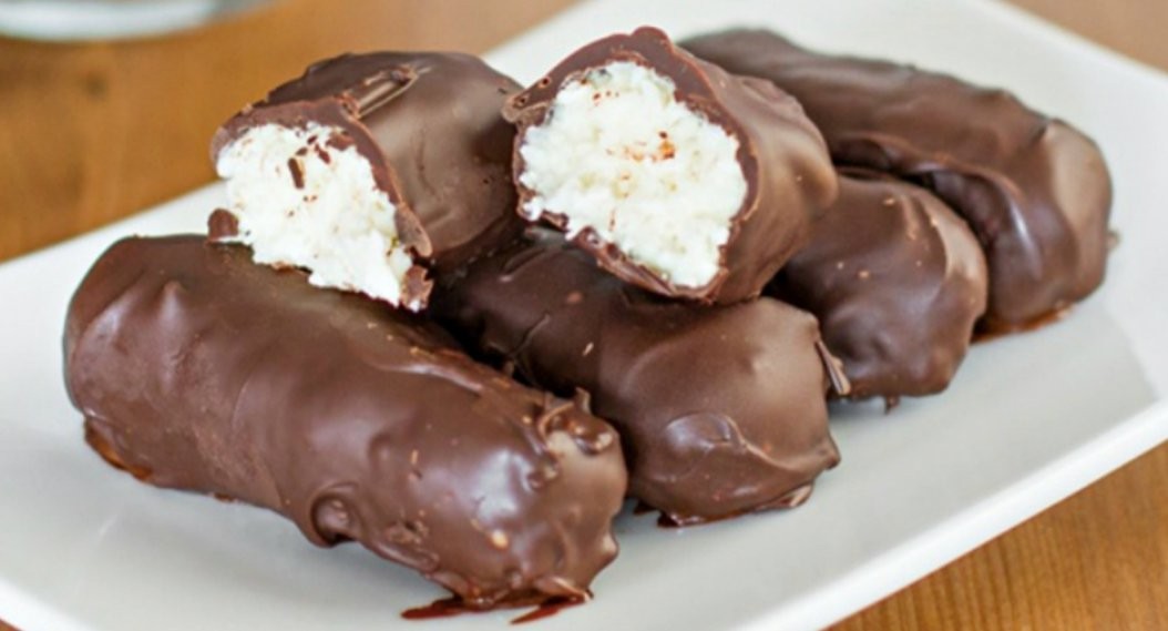 - Der letzte Schritt ist nur noch, die Kokosriegel in Schokolade zu überziehen.