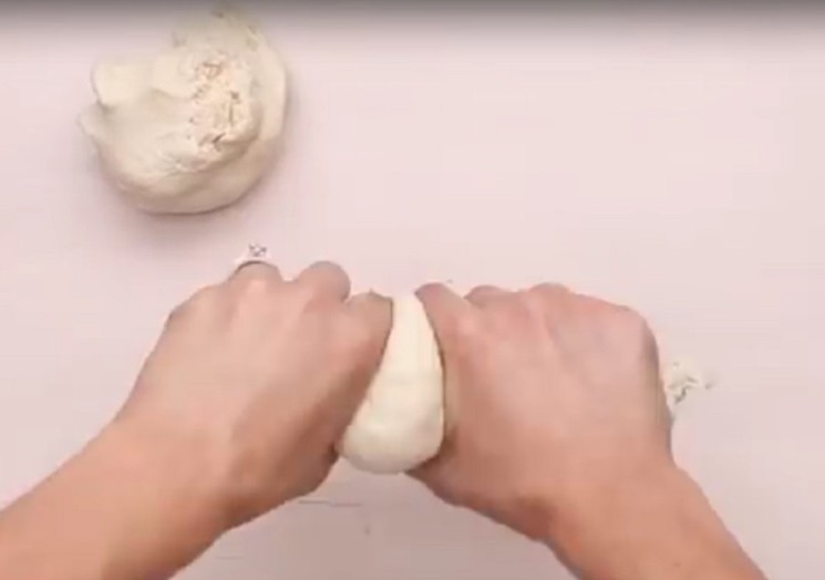 - Aus jedem Teigstück formen wir einen längeren Streifen.