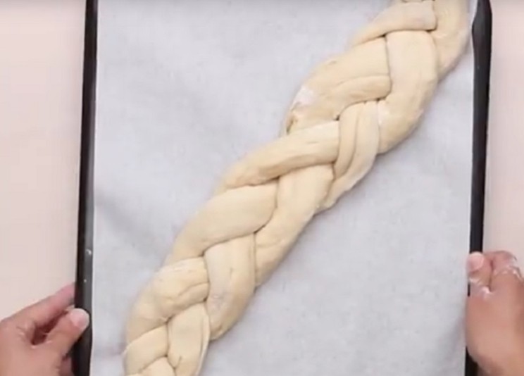 - Den fertigen Zopf legen wir auf ein Backblech mit Backpapier, bestreichen ihn mit Ei und bestreuen ihn mit Sesamsamen.