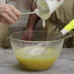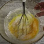 - Die Eier mit Zucker und Vanille schaumig schlagen.