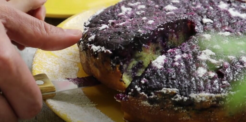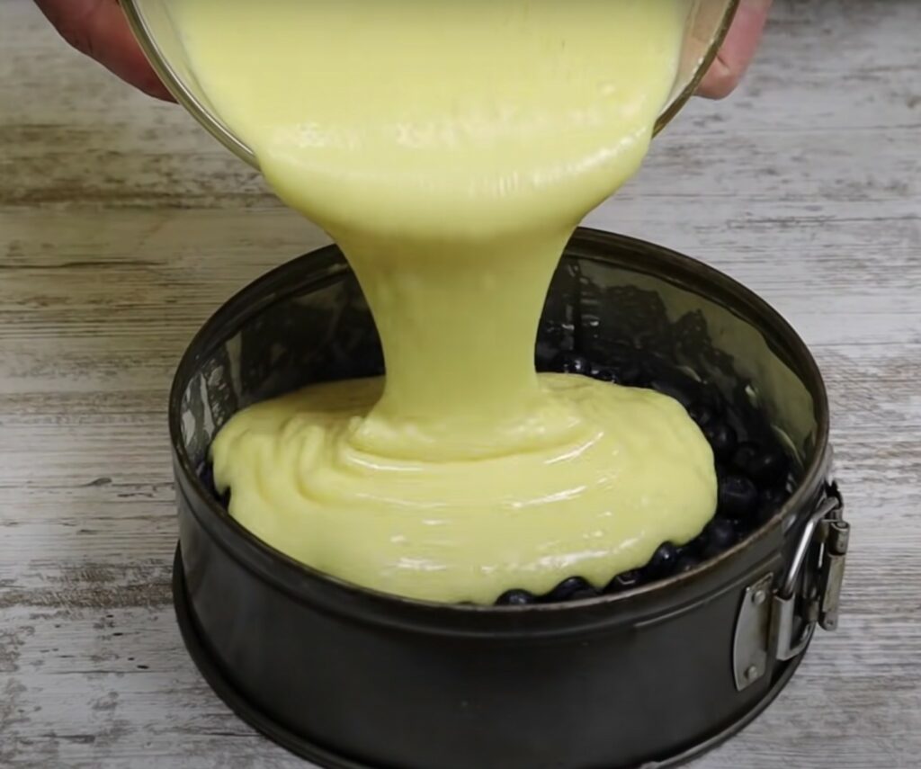 - Wir legen die Kuchenform mit Backpapier aus und bestreichen sie mit Butter. Die Butter mit etwas Kristallzucker bestreuen. Die Blaubeeren in die Form geben und den Teig hineingießen.