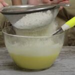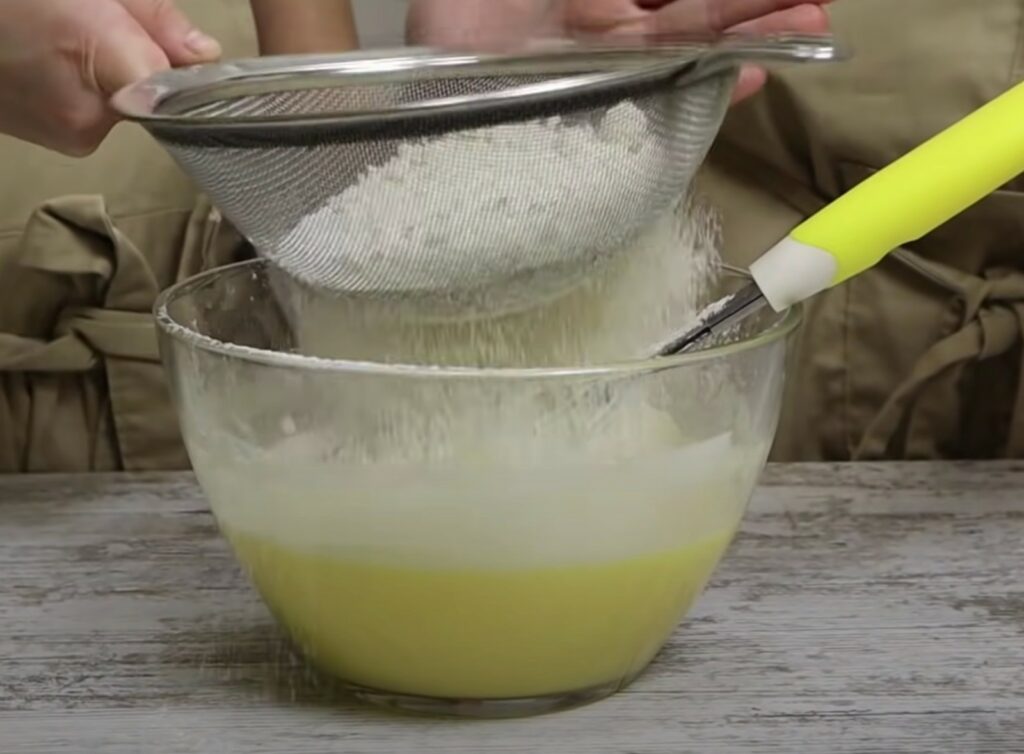 - In die Mischung rühren wir das gesiebte Mehl mit dem Backpulver ein.