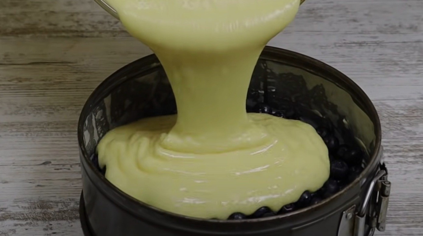 - Wir legen die Kuchenform mit Backpapier aus und bestreichen sie mit Butter. Die Butter mit etwas Kristallzucker bestreuen. Die Blaubeeren in die Form geben und den Teig hineingießen.