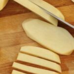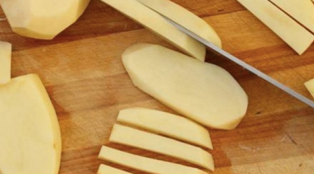 - Zuerst schneiden wir die Kartoffeln (in etwa 1 cm dicke Pommes).