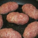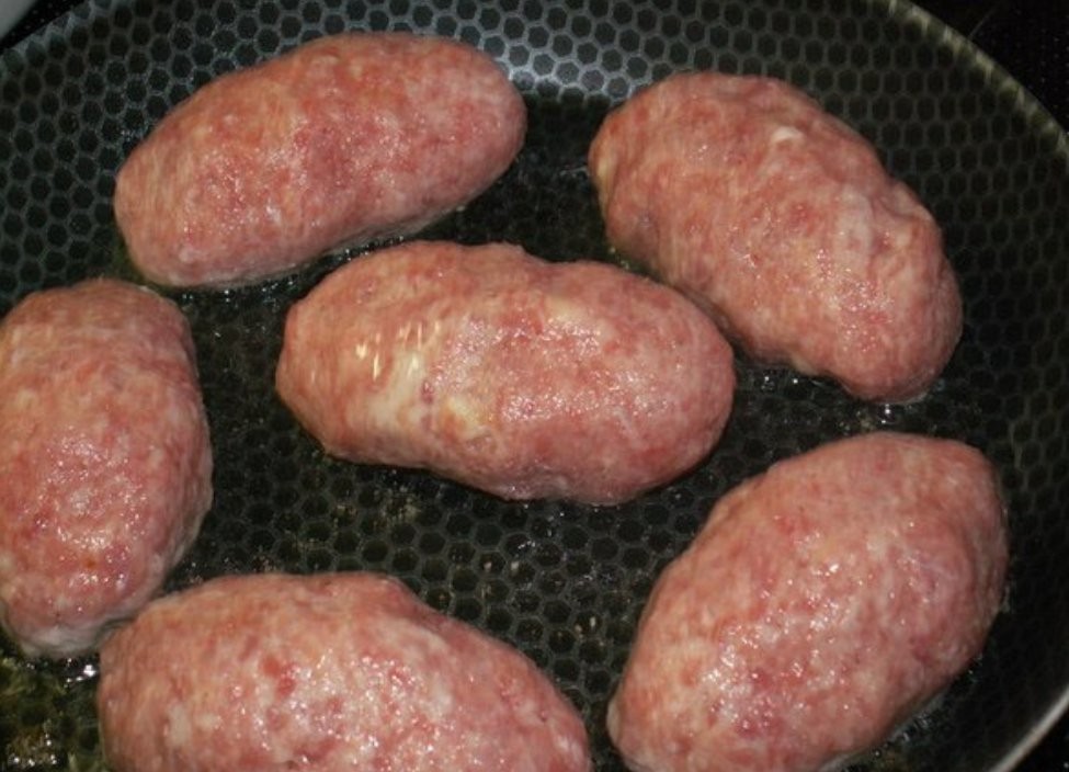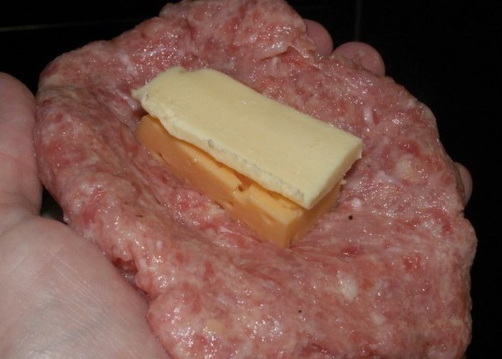 - Teilen Sie die Hackfleischmasse in 10-12 Portionen, formen Sie daraus kleinere Fladen und geben Sie in die Mitte Butter und Käse, sodass Frikadellen entstehen.