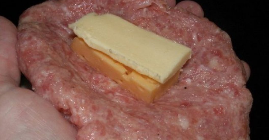 - Teilen Sie die Hackfleischmasse in 10-12 Portionen, formen Sie daraus kleinere Fladen und geben Sie in die Mitte Butter und Käse, sodass Frikadellen entstehen.