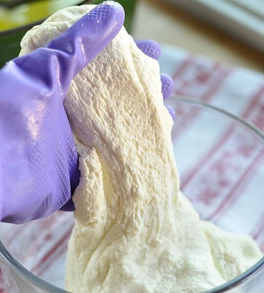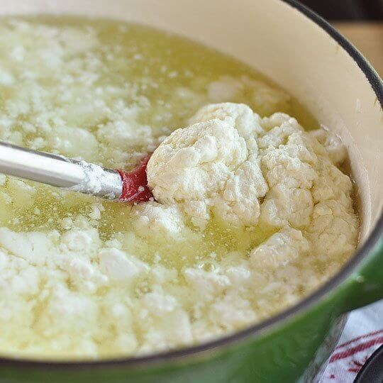 - Es wird wie das Kneten von Teig aussehen, der Käse zieht sich jedoch zusammen und es entsteht ein glänzendes Häufchen, wie auf dem Bild.