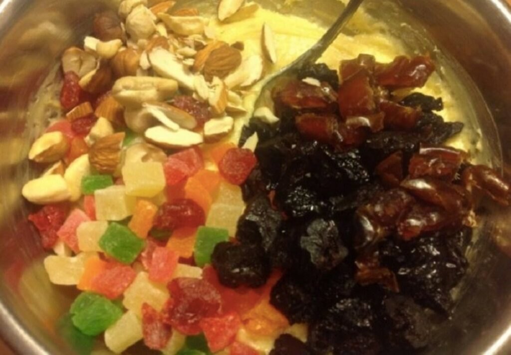 - Getrocknete und kandierte Früchte in kleine Stücke schneiden. Wenn Sie den Gugelhupf auch mit Nüssen zubereiten möchten, ist jetzt der richtige Zeitpunkt, diese hinzuzufügen (auch diese in kleinere Stücke schneiden.