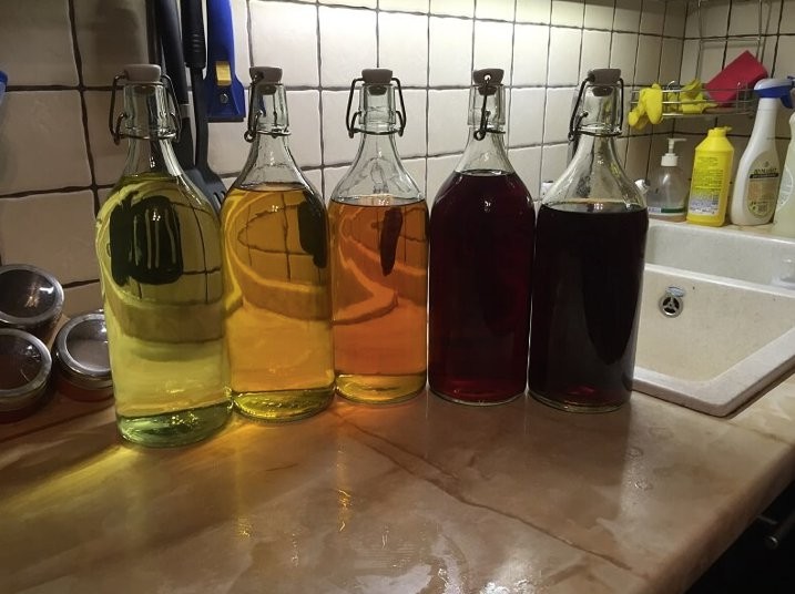 - Den abgesiebten Likör in verschließbare Gefäße füllen.