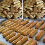 - Anschließend schneiden wir den Teig mit einem Messer in Stangen oder können mit Ausstechformen auch andere Formen ausstechen und diese dann vorsichtig auf ein mit Backpapier ausgelegtes Backblech legen.