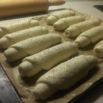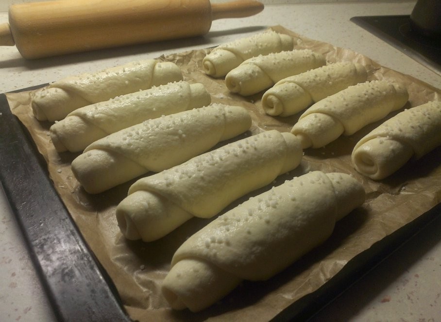 - Jedes Stück zu einer länglichen Platte ausrollen und zu einem Hörnchen rollen.