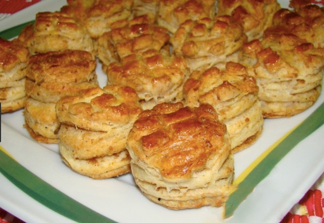 7. Wenn der Teig zuletzt ruht, rollen wir ihn auf eine Dicke von ungefähr 1 – 1,5 cm aus und stechen einzelne kleine Schmalzbrötchen aus – man kann ein Glas oder Ausstechform verwenden. Auf die Oberseite der Brötchen kann man das Gitter einer Kartoffelpresse drücken, um ein schönes Rautenmuster zu erhalten.