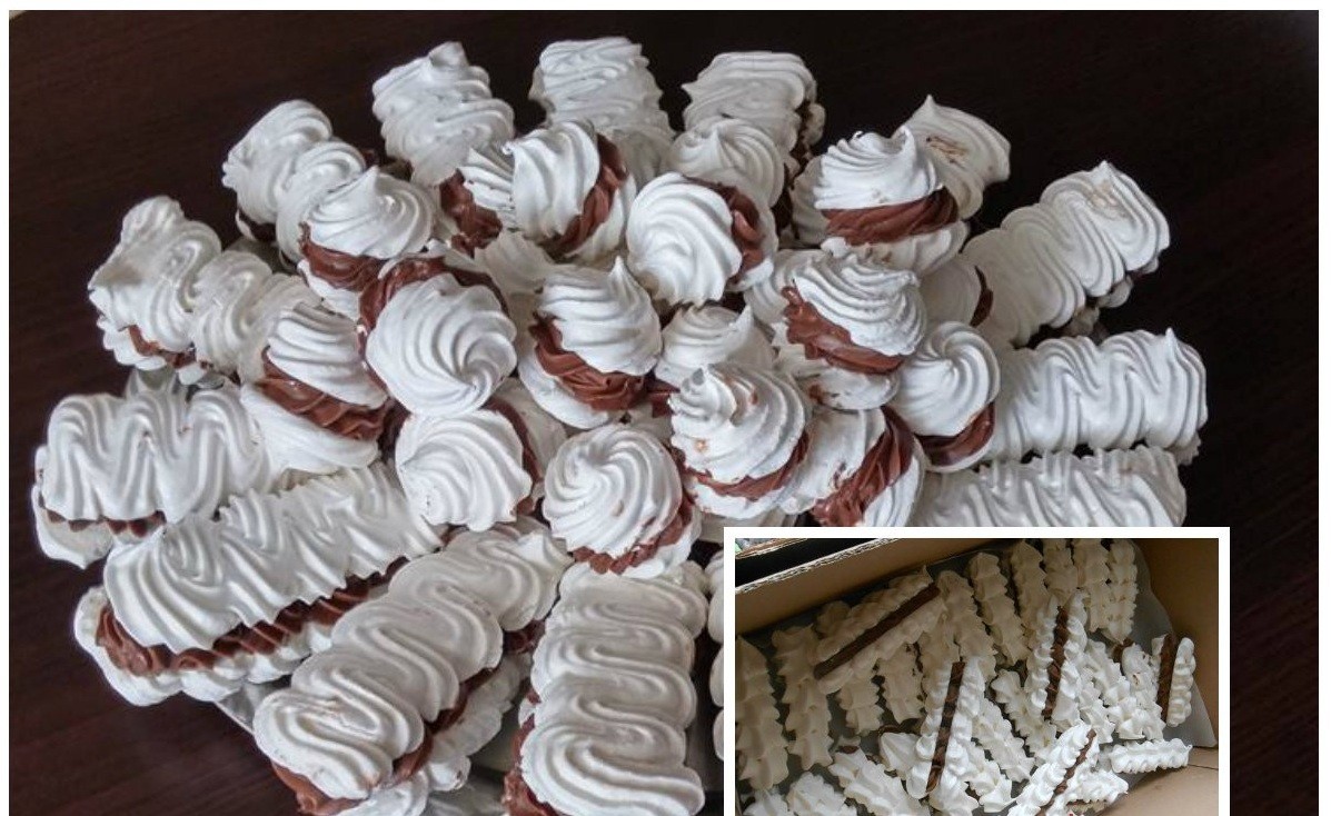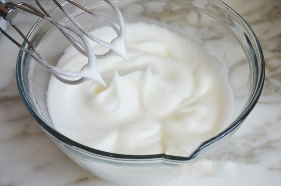 • Die Eiweiße schlagen wir über Dampf mit dem Zucker, wir geben auch eine Prise Salz hinzu. Die Creme muss dick und glänzend sein, vor allem muss sie gut die Form halten, damit man daraus verschiedene Formen auf das Backblech spritzen kann (schlagen, bis die Masse fest ist und man den Kristallzucker nicht mehr spürt).