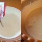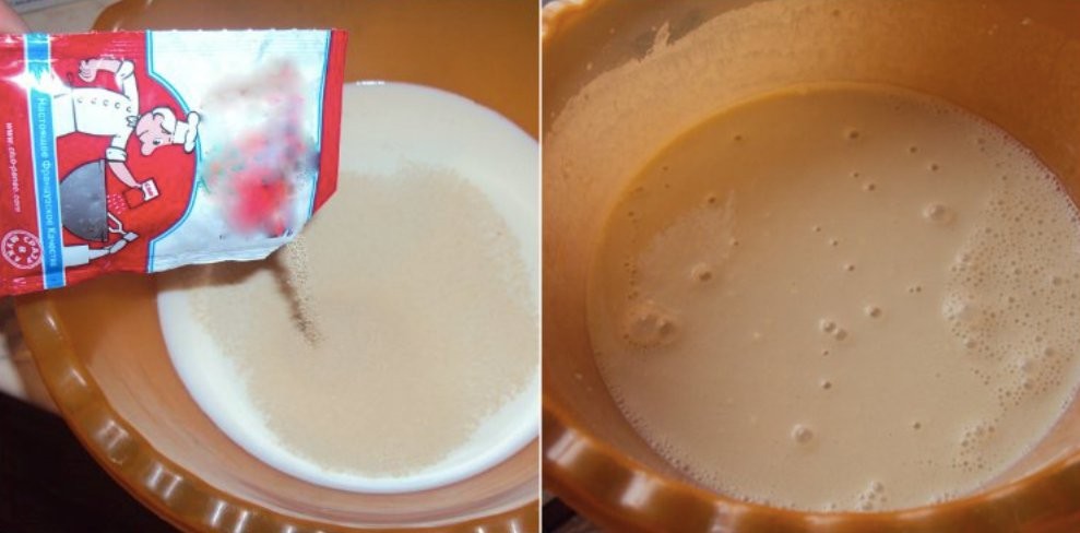 - In der warmen Milch rühren wir die Hefe ein und geben etwa 6 Esslöffel Mehl dazu.