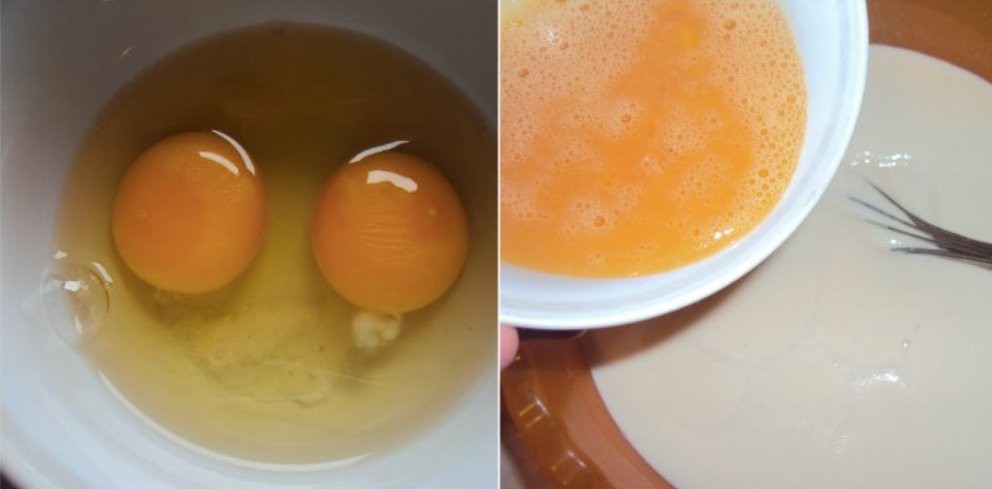 - Die Eier auf Zimmertemperatur mit einer Prise Salz verquirlen und nach und nach zum aufgegangenen Teig hinzufügen.