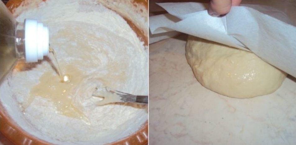 - Fügen Sie das restliche Mehl und das Öl hinzu, gegebenenfalls lauwarmes Wasser, falls erforderlich, und kneten Sie den Teig so, dass er am Ende nicht an den Fingern klebt.
