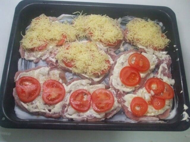 - Gemüse und Käse: Schneiden Sie die Tomaten in Scheiben und legen Sie diese auf die Schnitzel. Zum Schluss alles mit geriebenem Käse bestreuen.