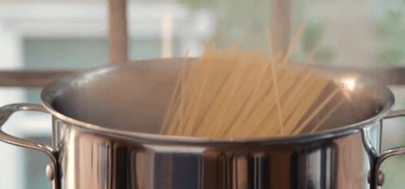 - Kochen Sie zuerst die Spaghetti in kochendem, gesalzenem Wasser. Nach etwa 7 Minuten sollten sie al dente sein, kontrollieren Sie sie aber zwischendurch lieber.