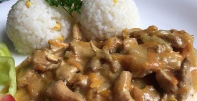 - Dann das Fleisch mit heißem Wasser übergießen, je nach Geschmack Salz und Pfeffer hinzufügen. Schmoren lassen und zum Schluss die saure Sahne, vermischt mit einem Löffel Mehl, sowie den Senf hinzufügen und alles zusammen noch 1 Minute kochen, damit die Sauce einreduziert. Als Beilage können Sie Reis oder klassischen Kartoffelbrei servieren.