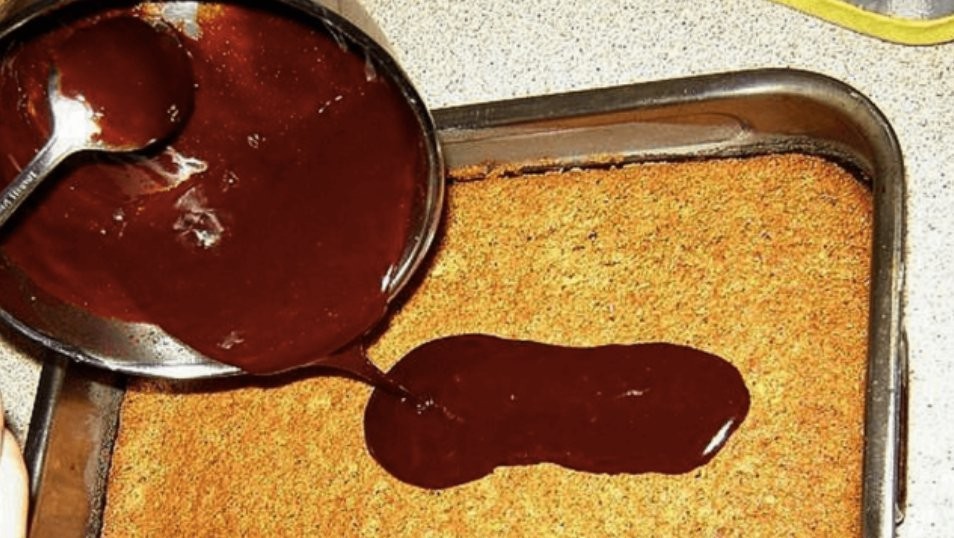 - Die Mischung auf die Herdplatte stellen, damit sie schmilzt. Anschließend die Mischung auf den erkalteten Kuchen geben.