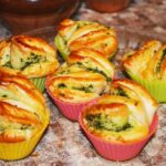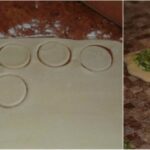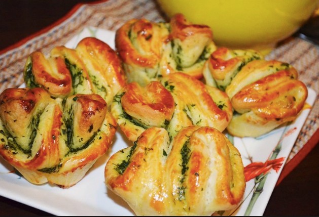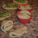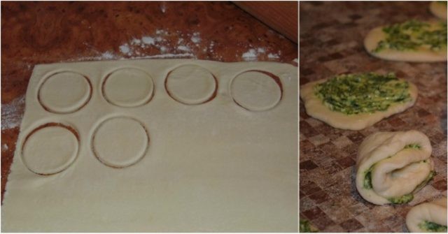 - Rollen Sie aus dem Teig kleinere Ringe, wobei Sie darauf einen Teelöffel der Kräuter-Knoblauch-Füllung geben. Falten Sie die Ringe so, wie es auf dem Bild gezeigt ist, oder Sie können alternativ auch eine mit Füllung gefüllte Rolle zubereiten, die Sie in kleinere Stücke schneiden.