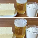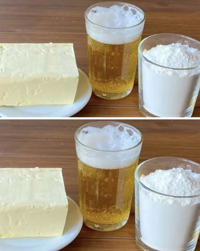 • Přidání piva Přilijte studené pivo a promixujte ještě 8–10 sekund. Těsto se rychle spojí do měkké, tvárné hmoty. Důležité je, aby směs zůstala studená – díky tomu je těsto po upečení jemné.