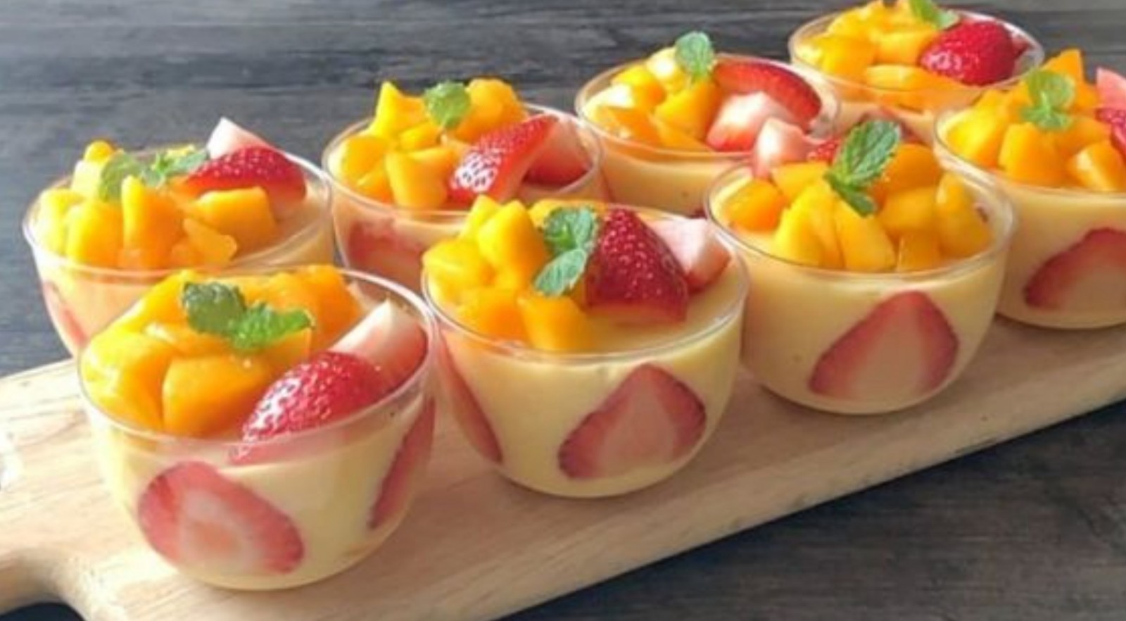 • Auf den Boden der Gläser Löffelbiskuits, Creme und Obststücke legen und die Gläser bis fast zum Rand füllen. Oben mit Obst und einem Minzblatt verzieren.