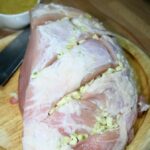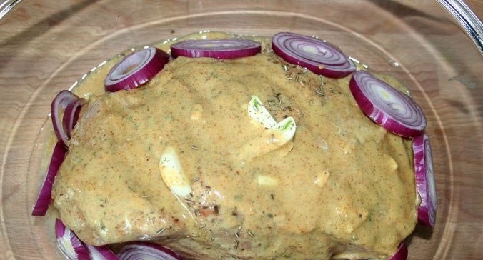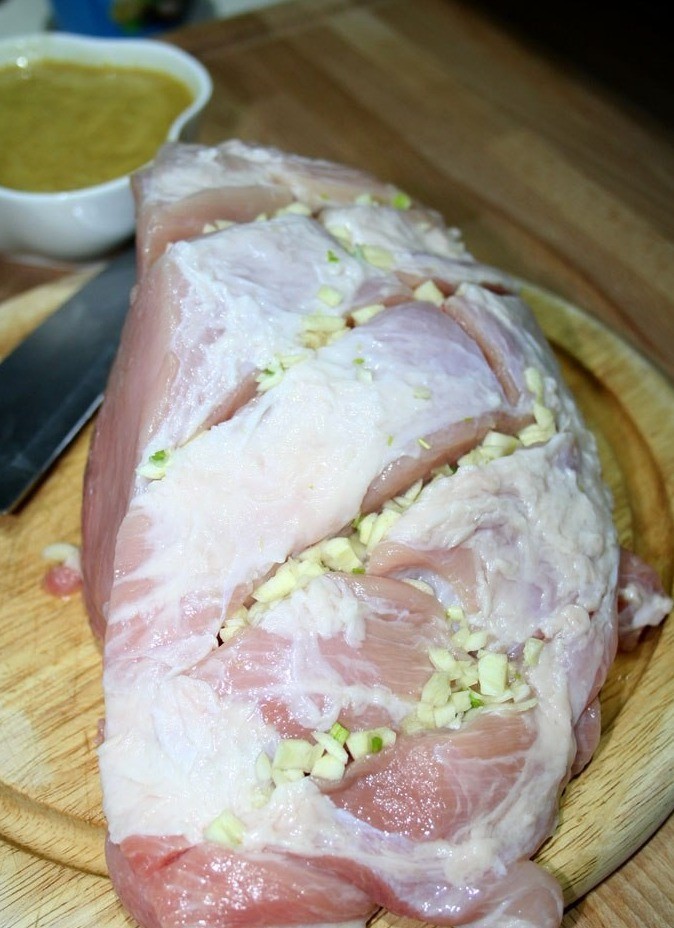 - Am besten lässt man das Fleisch über Nacht marinieren. Das Fleisch waschen, trocknen, einschneiden, marinieren und 24 Stunden stehen lassen. Am nächsten Tag reicht es, das Fleisch in den auf 180 ° vorgeheizten Ofen zu geben und etwa 1,5-2 Stunden zu backen. Zur Zubereitung der Marinade für das Fleisch mischt man jeweils 3 Esslöffel scharfen und normalen Senf, einen Esslöffel Honig, Salz, Pfeffer und scharfes Paprikapulver. Man kann der Marinade auch ein wenig Wasser hinzufügen. Den Knoblauch schälen und in kleine Stücke schneiden. Das eingeschnittene Fleisch mit dem gehackten Knoblauch füllen, wie auf dem Bild unten.