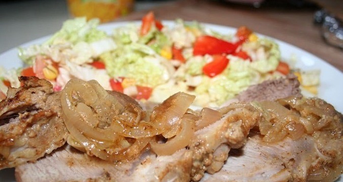 - Am nächsten Tag vor dem Braten aus dem Kühlschrank nehmen, zumindest bis der Ofen aufgeheizt ist. Mit Zwiebelringen belegen und in den Ofen geben. Zuerst abgedeckt backen und etwa 40 Minuten vor Ende den Deckel entfernen.