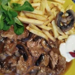 Den Nacken mit Sauce heiß servieren – idealerweise mit selbstgemachten Pommes, aber auch gekochter Reis passt hervorragend. Mit frischen Kräutern oder einer Gemüsebeilage garnieren.