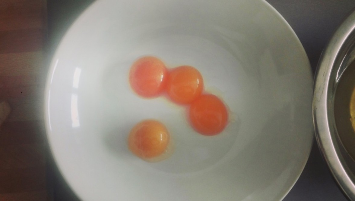 - Zum Parmesan geben wir 4 Eigelbe und verrühren sie zu einem Brei. Wenn der Brei zu dick ist, können wir noch ein Eigelb hinzufügen.