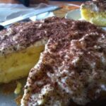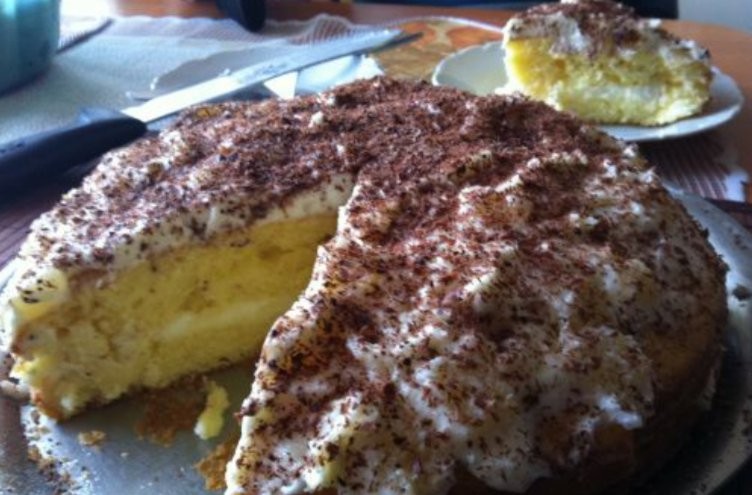 - Nach dem Abkühlen auf den zweiten Boden (die Seiten des Kuchens) streichen, mit dem dritten Boden abdecken, auf den du den beiseitegelegten Rest der Quarkcreme streichst, und mit geriebener Schokolade verzieren.