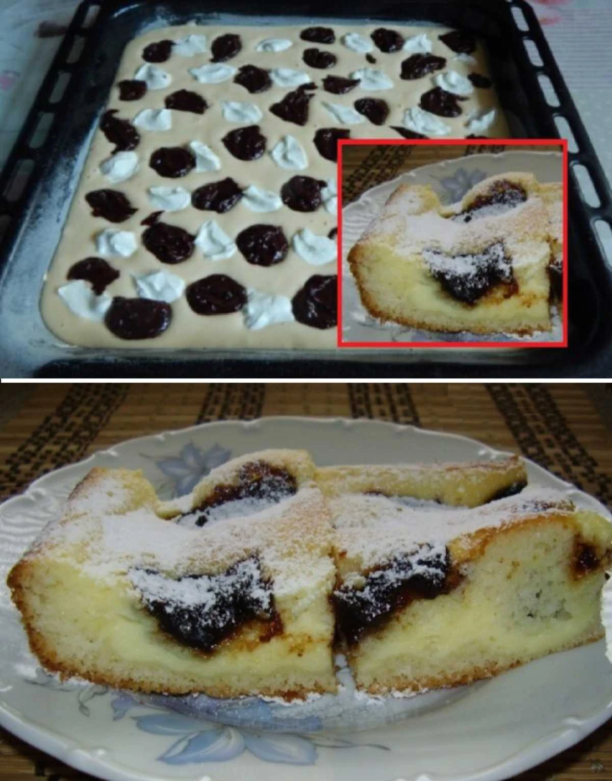 • Quark und Konfitüre hinzufügen Quark mit Puderzucker und einer kleinen Menge Öl vermengen. Vorsichtig den Quark in kleinen Häufchen („fliačky“) auf den Teig setzen. Auf den restlichen Teig den Aufstrich auftragen und die Kondensschokolade tröpfeln.