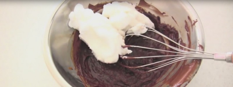 - Přidání bílků: Nejprve přidejte třetinu našlehaných bílků do čokoládové směsi a jemně promíchejte. -> Eiweiß hinzufügen: Geben Sie zuerst ein Drittel des geschlagenen Eiweißes zur Schokoladenmischung und rühren Sie es vorsichtig unter.