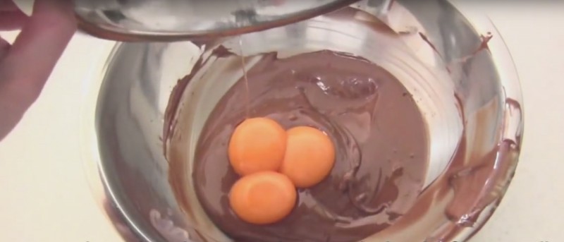 - Spojení čokolády se žloutky: Vmíchejte žloutky do rozteklé čokolády a důkladně promíchejte. -> Schokolade mit Eigelb verbinden: Rühren Sie das Eigelb in die geschmolzene Schokolade ein und vermischen Sie alles gründlich.