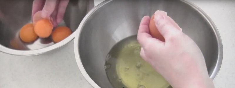 - Oddělení vajec: Nejprve oddělte žloutky od bílků a bílky dejte do lednice, aby byly chladné. -> Eier trennen: Trennen Sie zuerst das Eigelb vom Eiweiß und geben Sie die Eiweiße in den Kühlschrank, damit sie kalt sind.